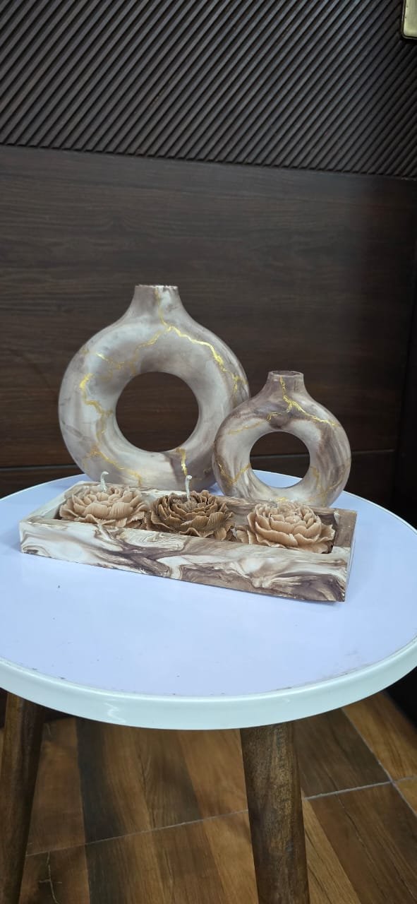 Add a touch of modern elegance to your home décor with our Donut Vase Set with Candle Tray. This beautifully designed set features minimalist donut-shaped ceramic vases paired with a sleek matching tray, perfect for holding candles, flowers, or decorative accents.
